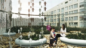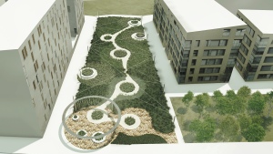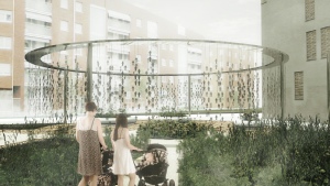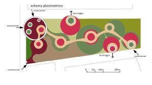 La strutturazione dello spazio attraverso la semplice concatenazione di una forma primaria (cerchio) definisce un artificiale e vario puzzle di elementi plastici (anello-tenda della piazza e sedute) e vegetazionali. Se il perno denominagto Piazza del Girotondo definisce l'ancoraggio al sistema urbano producendo un ambito riconoscibile e ludico nel quale la comunità si autorappresenta così la naturale instabilità e variabilità delle sistemazioni a verde operano sul piano percettivo profondo dove la coscienza dello scorrere del tempo smette di essere un concetto astratto e normativo ma torna ad evidenziarsi nella sua oggettività delle trasformazioni stagionali.